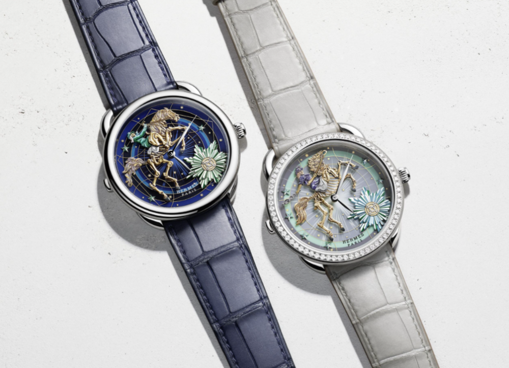 The other two releases, meanwhile, hark back to the maison’s equestrian roots. Limited to just 24 pieces and fashioned from grade 5 titanium, the Arceau Duc Attelé houses the Hermès H1926 manual winding movement, boasting a tourbillon and minute repeater complication, alongside a curved hours and minutes display that resembles a galloping horse. The six-piece Arceau Chorus Stellarum, meanwhile, is an elaborate display of champlevé, lacquer and painted stars, complemented by a yellow-gold horse applique that rears up at the push of a button. Powered by the automatic Hermès Manufacture movement H1837, it offers a 50-hour reserve and a balance frequency of 28,800 vibrations per hour.