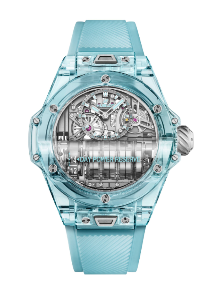 But the real heavyweight is the MP-11. First released at Baselworld 2018, this new 50-piece edition captivates with its groundbreaking “Water Blue” sapphire case, formulated with a fresh chemical formula, and still boasts all the essential properties of sapphire: brilliant, luminous, perfectly inalterable, and 100% resistant to knocks and scratches. It’s cool not only in terms of look and feel, but also optimal for this movement, allowing a clear view into the impressive construction featuring seven coaxial and vertical barrels that packs a long, long power reserve – 336 hours, or two weeks, to be precise!
