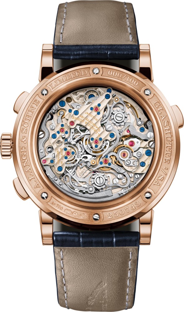The brand’s precision and expert craftsmanship can be seen through the sapphire-crystal caseback, which showcases the intricacies of the chronograph movement, as well as five gold chatons, heat-blued screws, Glashütte ribbing, and the hand-engraved balance cock.