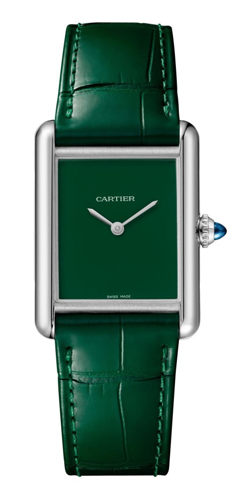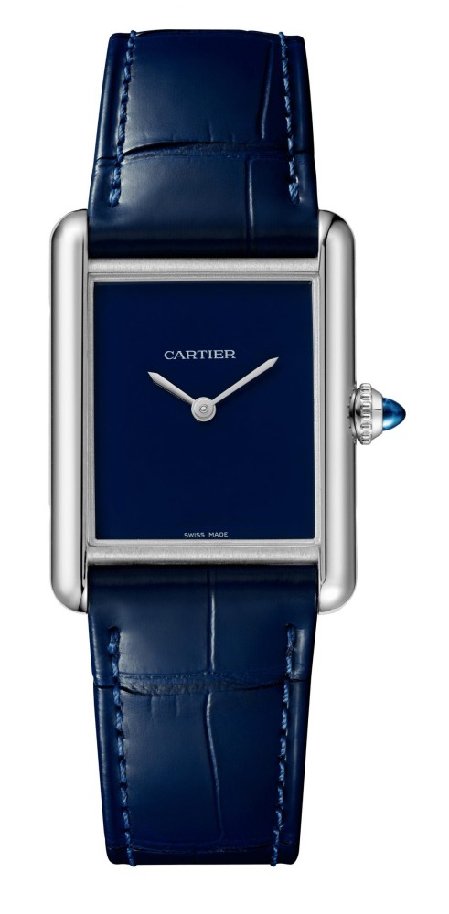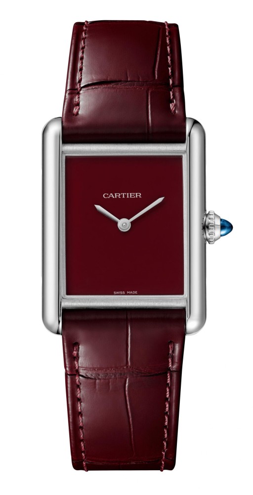 The monochrome Tank Must comes in three colour options with matching straps: rich burgundy, deep blue and dark green. The clean aesthetic is taken even further with a plain dial and the absence of Roman numeral hour markers, given it an ultra minimalistic look.