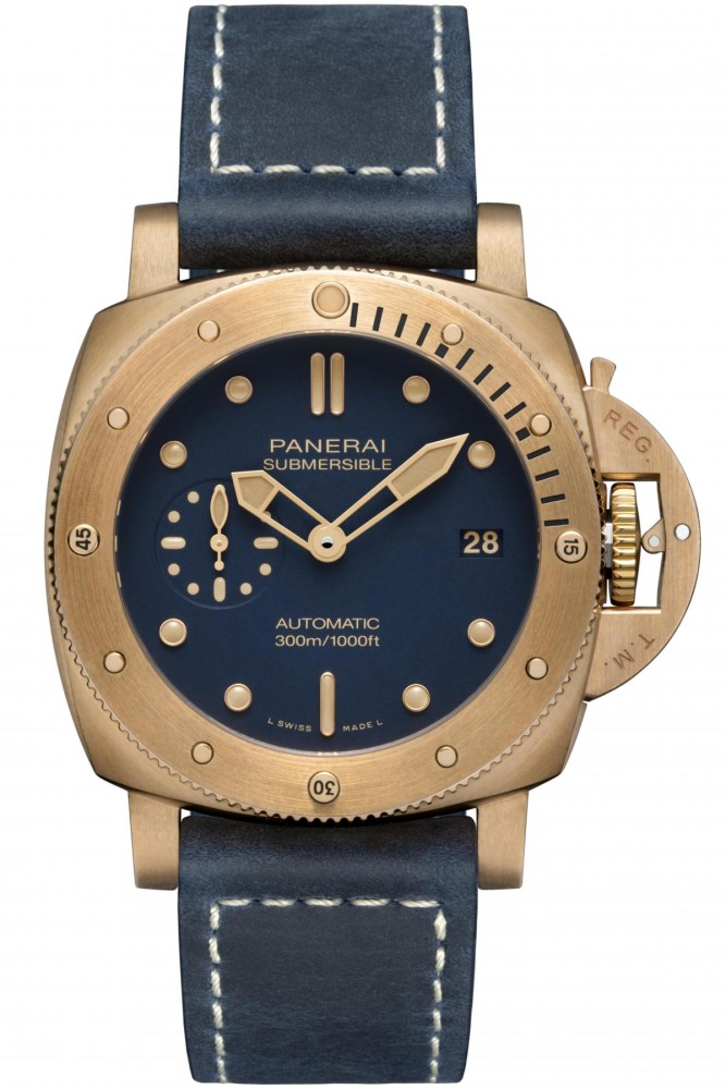 Available exclusively from Panerai boutiques in a limited run of 1,000 pieces a year, the Submersible Bronzo Blu Abissohas a matching blue vintage suede leather strap with ecru stitching and a trapezoidal bronze pin buckle in bronze. A second blue rubber strap, along with a screwdriver for changing and removing the buckle, is also included.