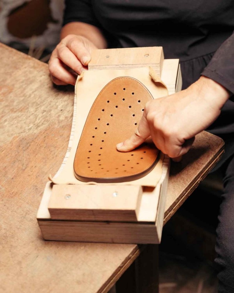 When the bag is sent for stitching, the first stitches are, of course, not done with thread. In order for the stitches to respect and conform to the individual shape of each handmade bag, the holes are pierced with a hot tool in order to create clean holes through the leather. The work requires meticulous attention in order not to burn or ruin the leather. Only once all the stitching holes have been pierced can the thread go through.