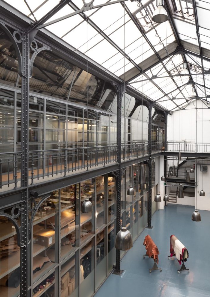 Assembly requires similar rigour. Artisans, who sit on the ground floor of the hangar under dramatic skylights showing the mostly cloudy skies of Brussels, first lay out all the pieces of one bag. They then complete the finishes required for the bag before it is sent for stitching. Every piece of leather has three layers of colour applied to it during the finishing process and each layer of colour is sanded before the application of the next layer. All edges are hand-finished and -painted. The process is so painstaking that artisans are asked to switch styles every month so they do not become fatigued.