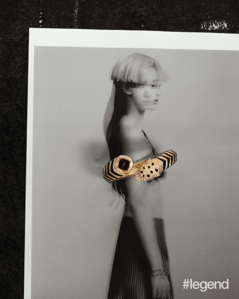 Panthère de Cartier bangle watch in 18K yellow gold with diamonds, emeralds and lacquer by Cartier, black pleated skirt by MM6 Maison Margiela,