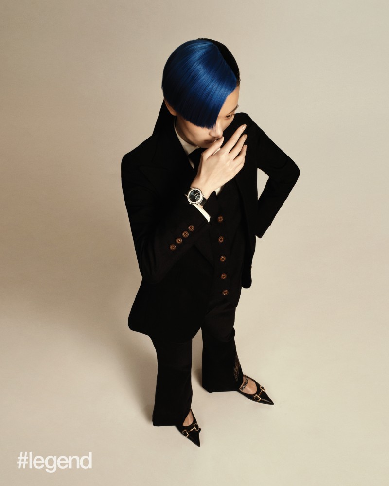Tambour All Black Petite Seconde watch by Louis Vuitton, black blazer and top by Balenciaga