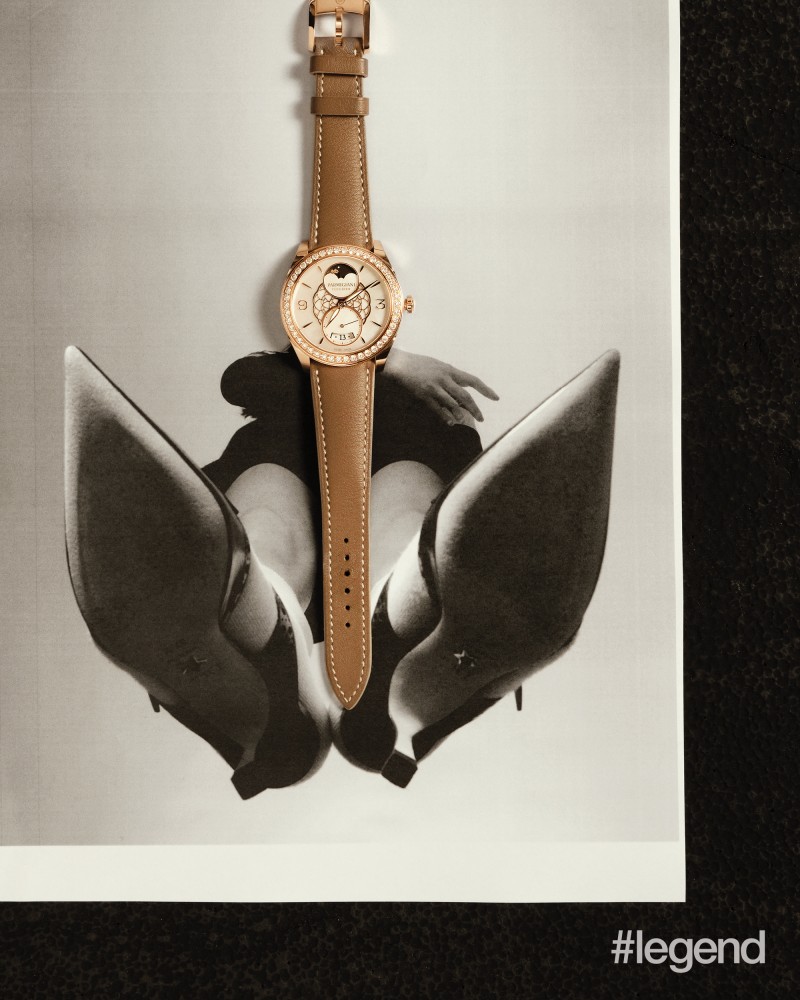 Tonda Sélène 36mm watch in 18K rose gold with mother-of-pearl dial by Parmigiani Fleurier, pumps by Dior -