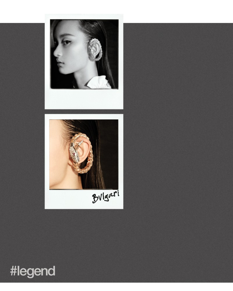 Serpenti bracelet watch in 18K white and yellow gold with diamonds and rubies by Bvlgari, white ruffled dress by Lanvin -