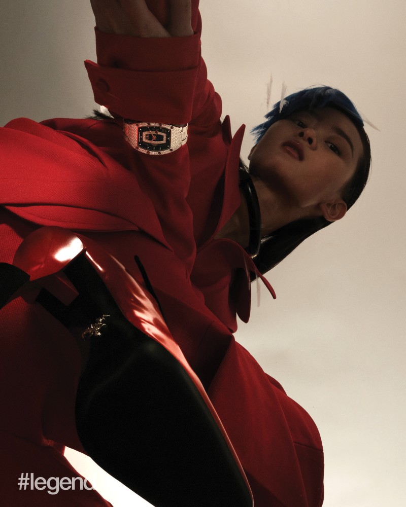RM 037 full pavé diamond watch in 18K white gold by Richard Mille, red jacket, trousers and black choker by Bottega Veneta, red pumps by Prada -