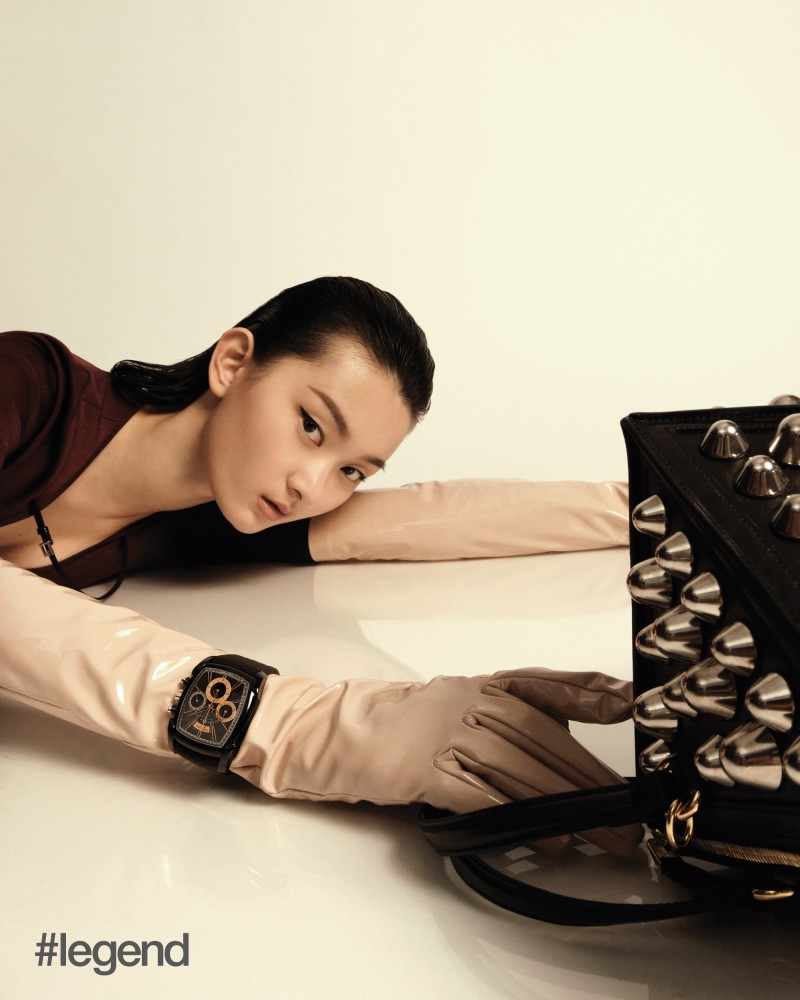 Kalpagraphe Noir steel watch black ADLC and 18k rose gold by Parmigiani Fleurier, plum top, nude gloves and black studded handbag by Gucci