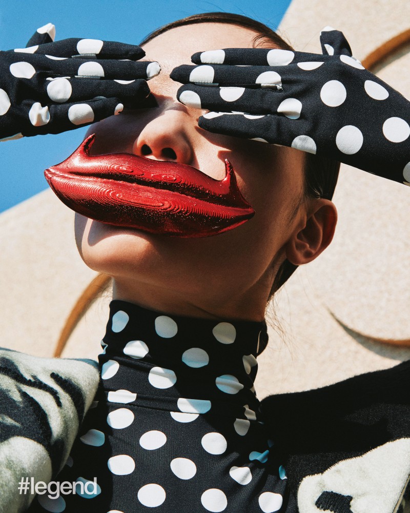 0 Moncler Richard Quinn black and white polka-dot bodysuit, Valentino printed coat, Prada white skirt with flowers and Shuting Qiu red metallic mouthpiece -