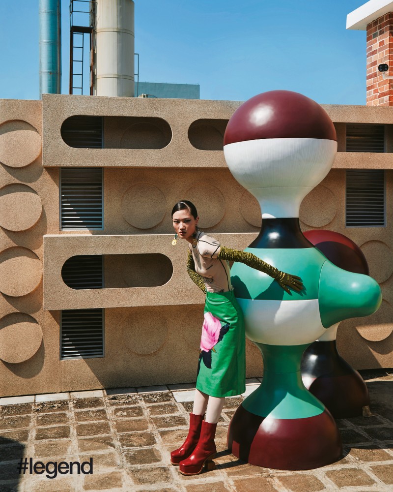 Villa XRWA nude top, Gucci green ruched gloves, Prada green leather skirt with floral print and yellow floral leather earrings, and Loewe red platform boots -