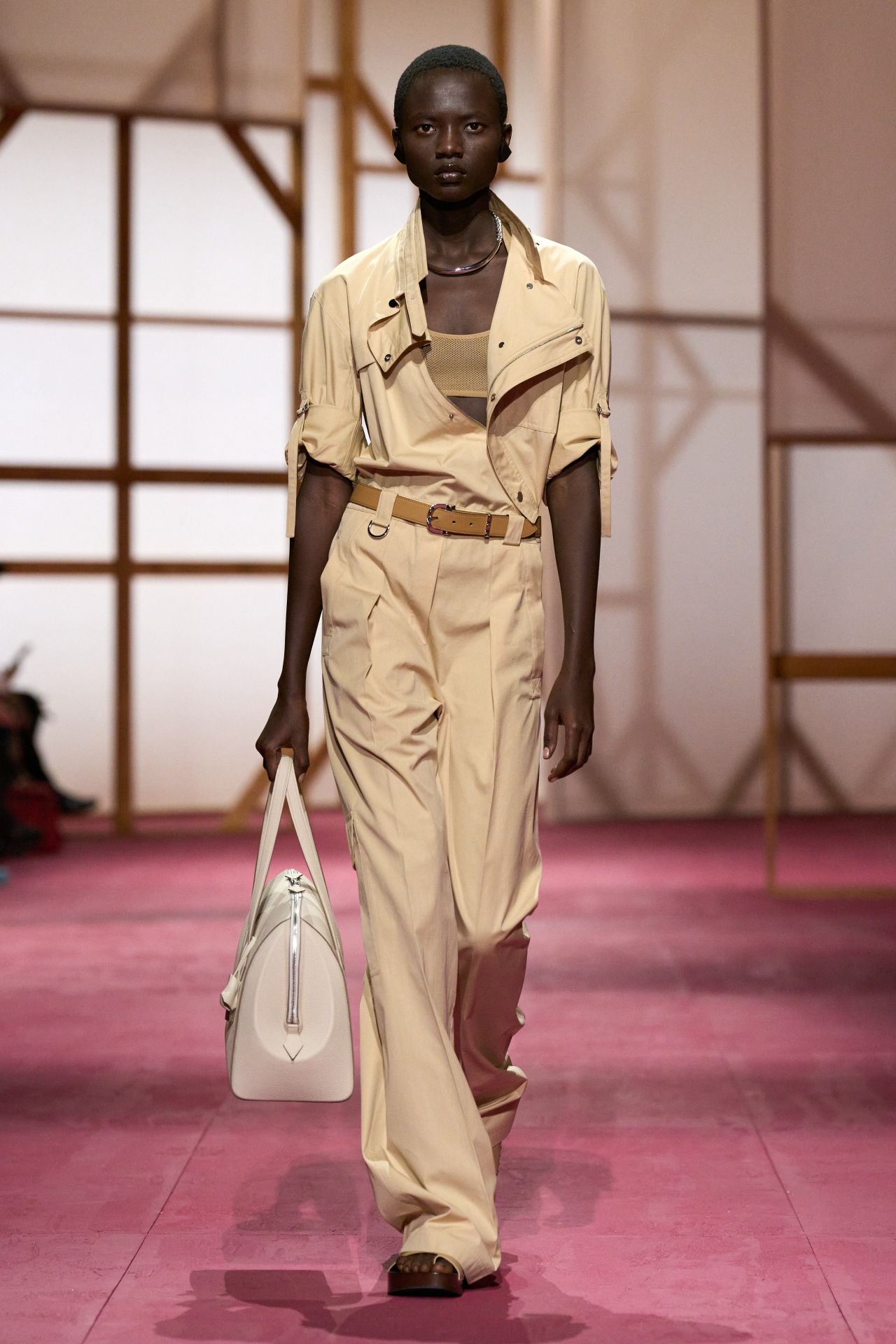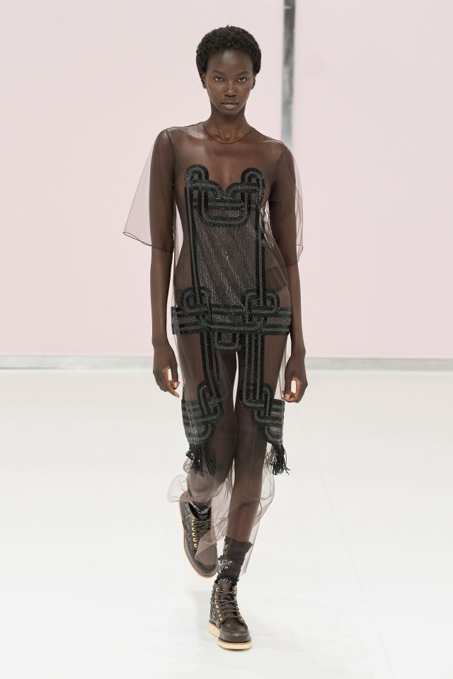 The pragmatic artist-in-the-studio inspiration and a surprising sensuality were the two main elements of this season under Nadège Vanhee. Sheer materials were used creatively for transparent summer looks. Leather continued to be a highlight, made with haute couture techniques, patterned cuts and prints on the material.