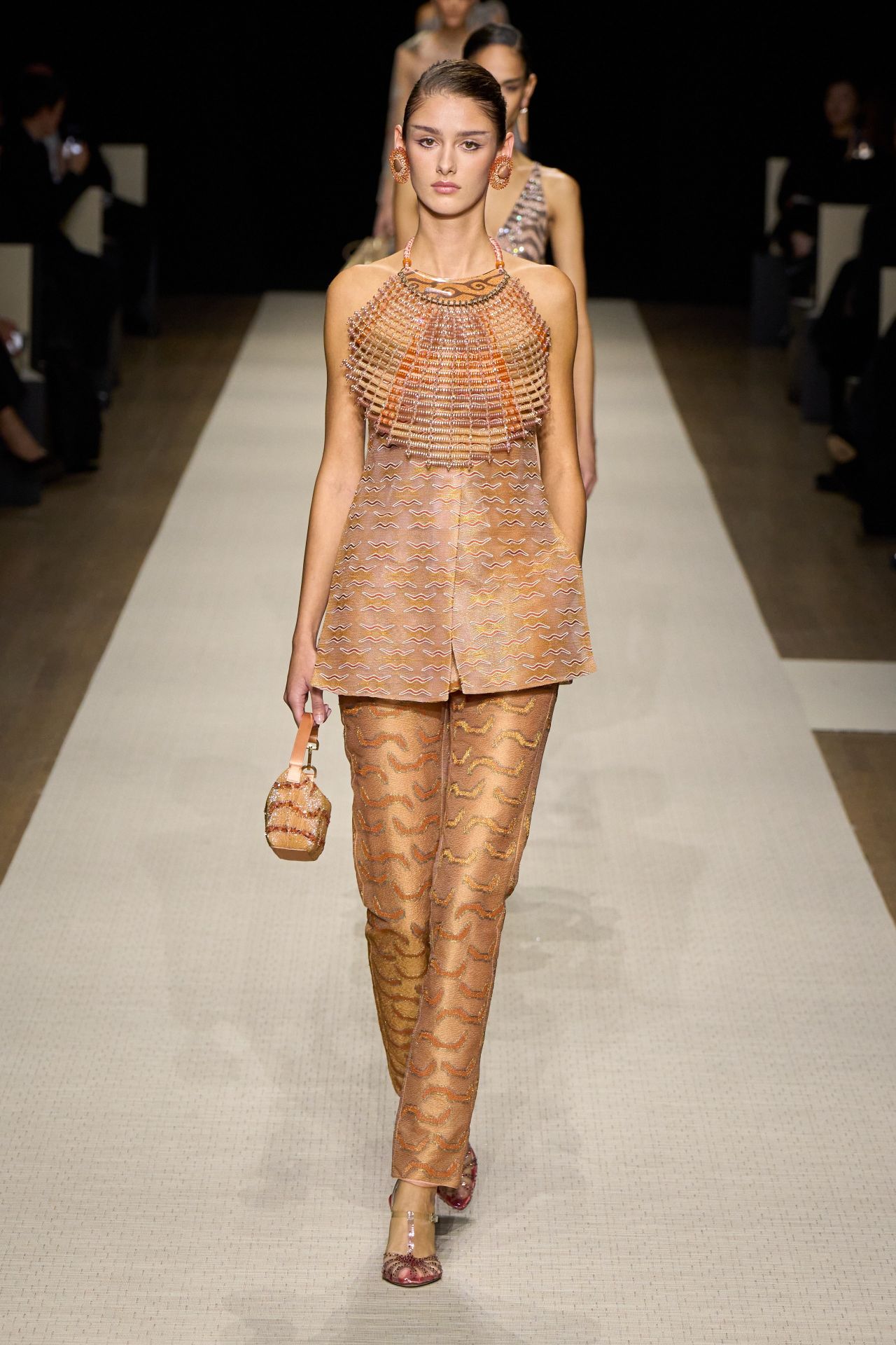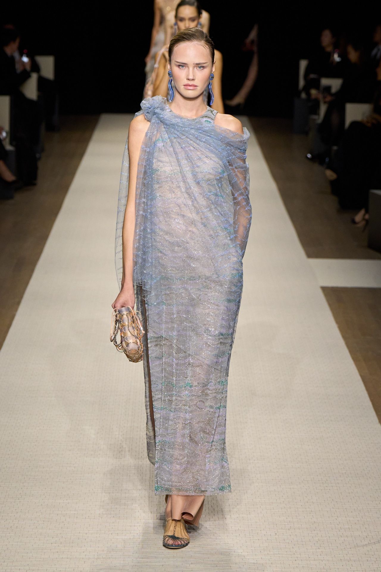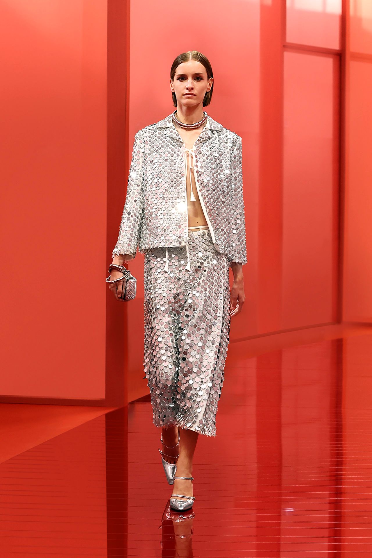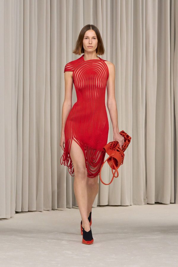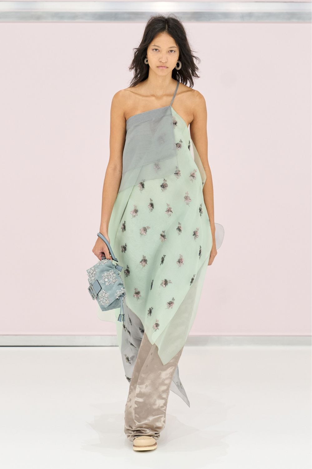 As Fendi celebrates the centenary of its founding, Kim Jones took us back to the brand’s origins, paying tribute to the 1920s. Sheer frocks with dropped waists, fringe elements and knitted co-ords with boy shorts harked back to the art deco glamour of the 1920s with a modern nod to 2025. Handbags were also a highlight, with a bigger and more casual makeover of the iconic Baguette known as the Mamma Baguette.