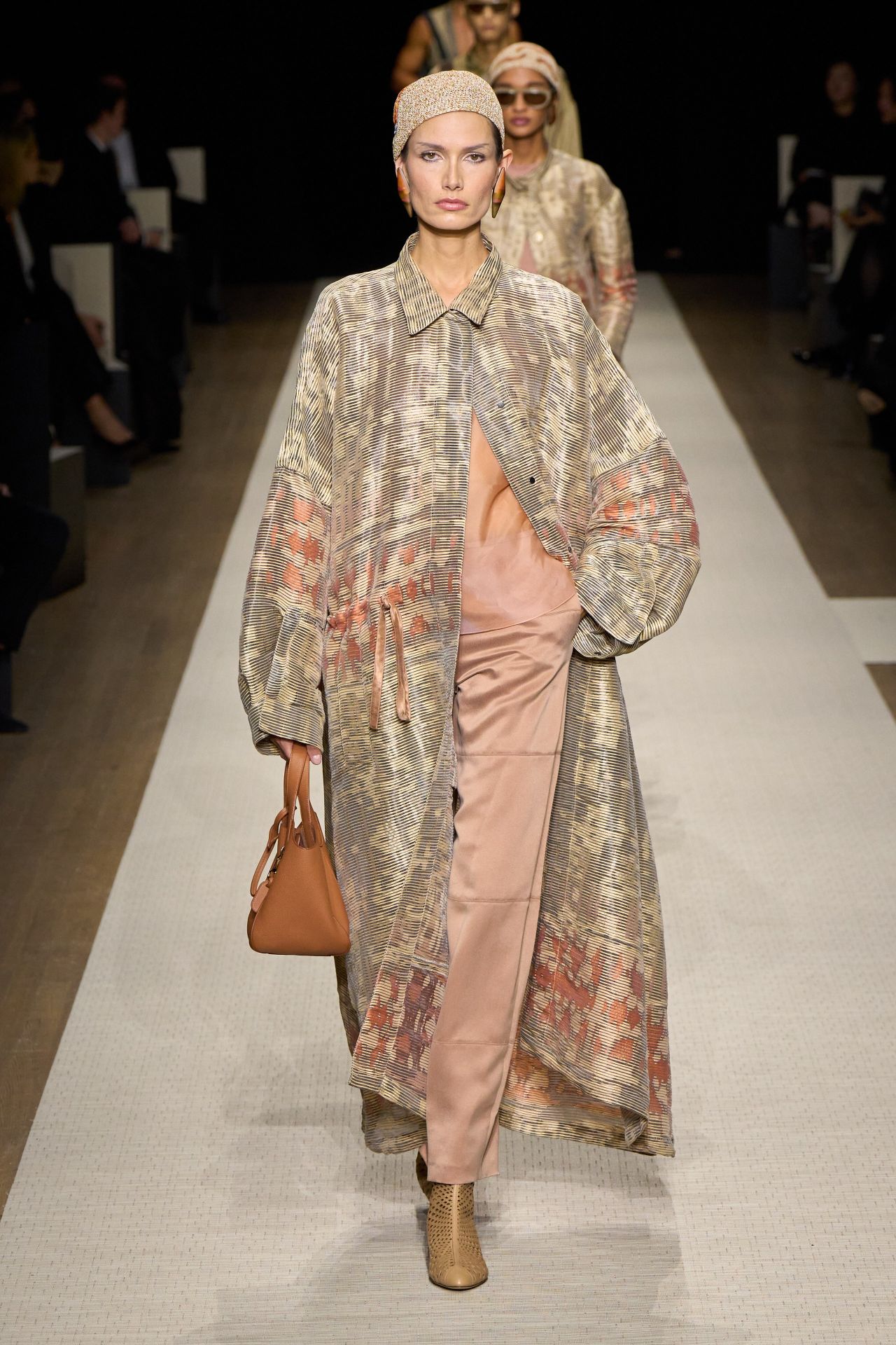 Giorgio Armani’s collection highlighted both the freedom of women’s tailoring and a New York twist. Dressed in soft men’s blazers with satin trousers, ties and square-toe ballet flats, models showed an elegant expression of rebellious style. Armani’s signature neutral palette was constant throughout the show, with beige, grey and khaki dominating the runway.