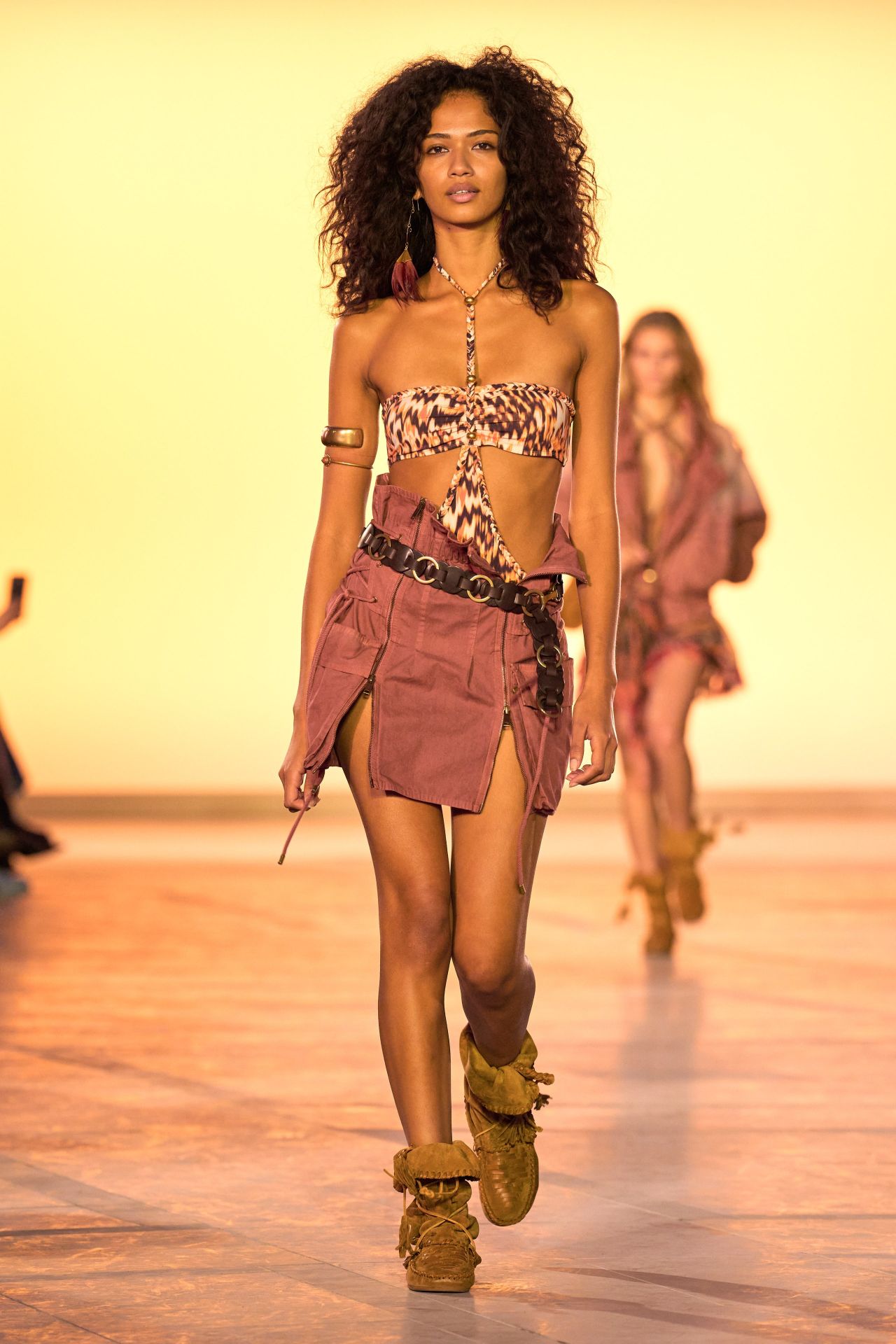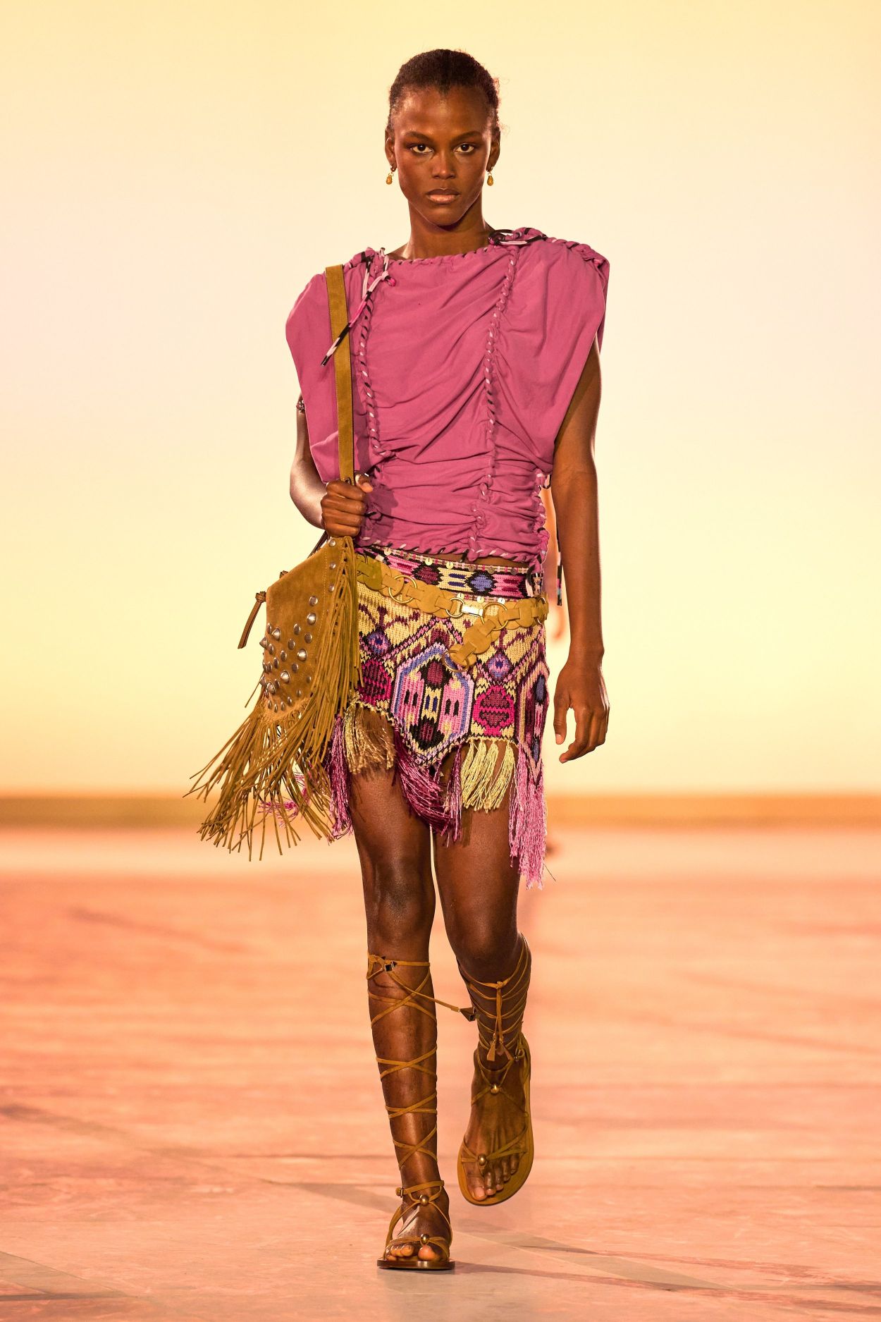 Tropical inspiration from the Amazon meets Isabel Marant’s signature artisanal spirit. The show was alive with fringed jackets, skirts and boots, and an intricate knotting technique on the neckline emphasised the core craftsmanship of this collection. Pinks, oranges, sand-beige and midnight blues contrasted with minimalist blacks.