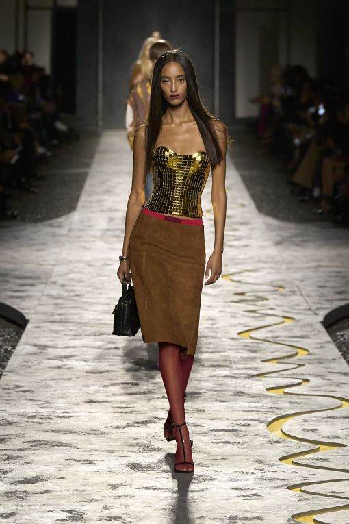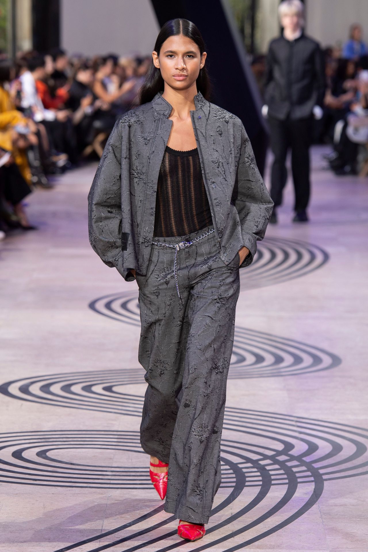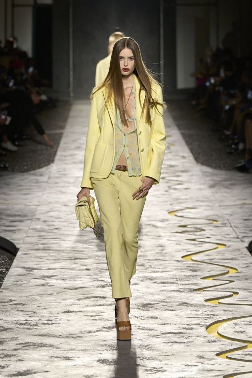 In this collection, Anthony Vaccarello introduced a fluid suit look inspired by Yves Saint Laurent, featuring double-breasted suits that accentuate a body with wider shoulders and narrowed at the waist. Another part of the collection took on a more bohemian style, with tonal ensembles transforming into technicolour dresses, along with draped and embroidered looks.