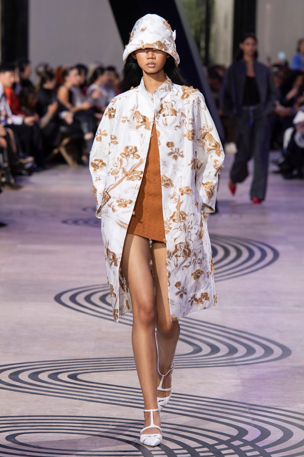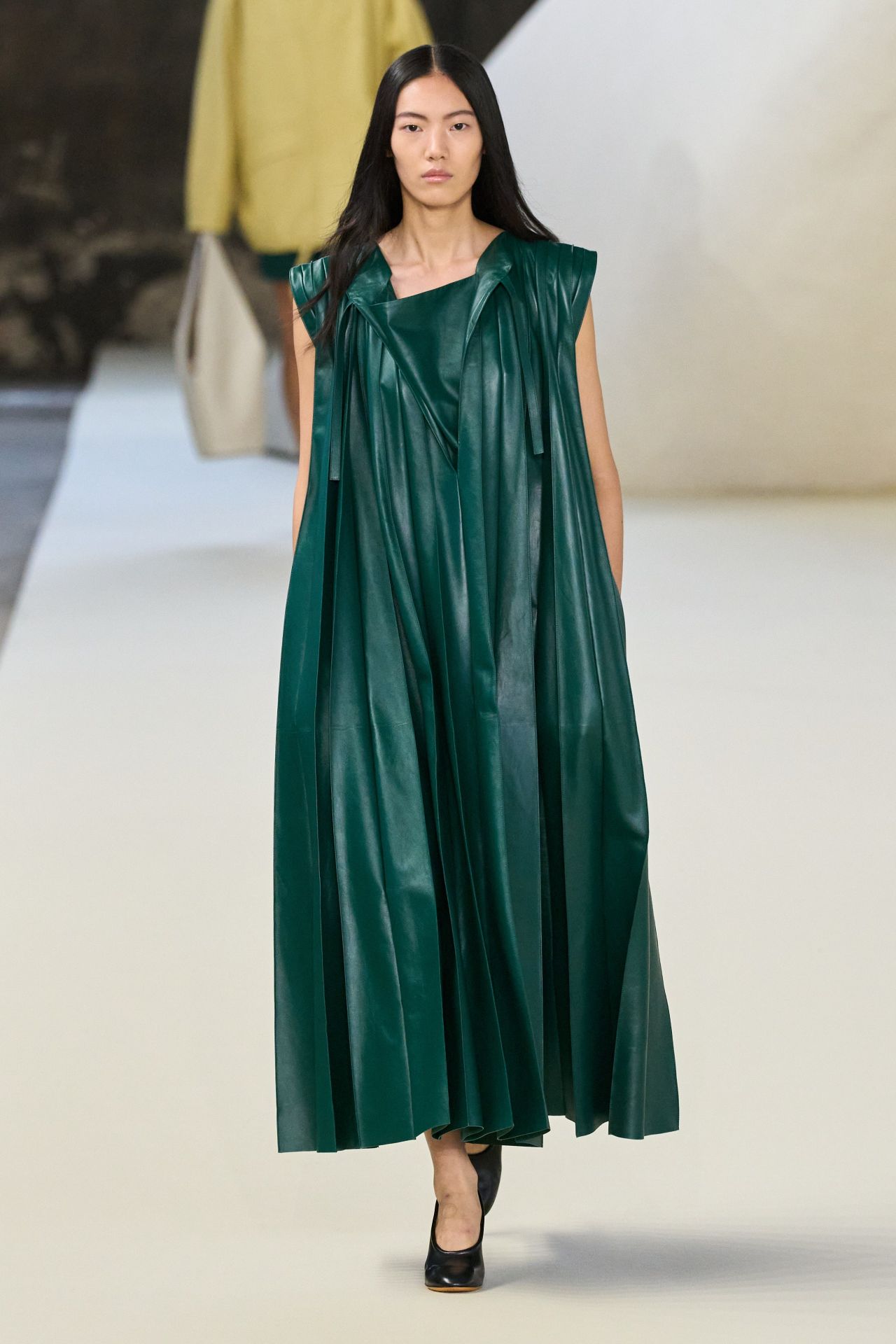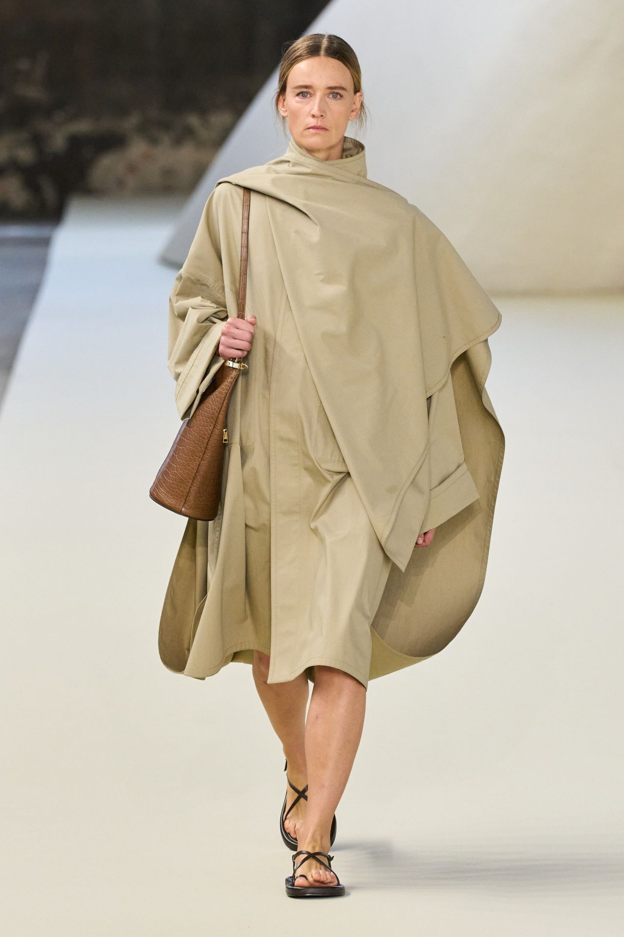 Matteo Tamburini presented a collection inspired by a journey along the Mediterranean coast, with an emphasis on “Artisanal Intelligence”. The iconic trench coat, made of cotton and leather, was presented with a new, flowing silhouette in various lengths. The coastal theme continued in the natural colour palette, featuring sea blue, meadow green, sand and rock-face bronze.