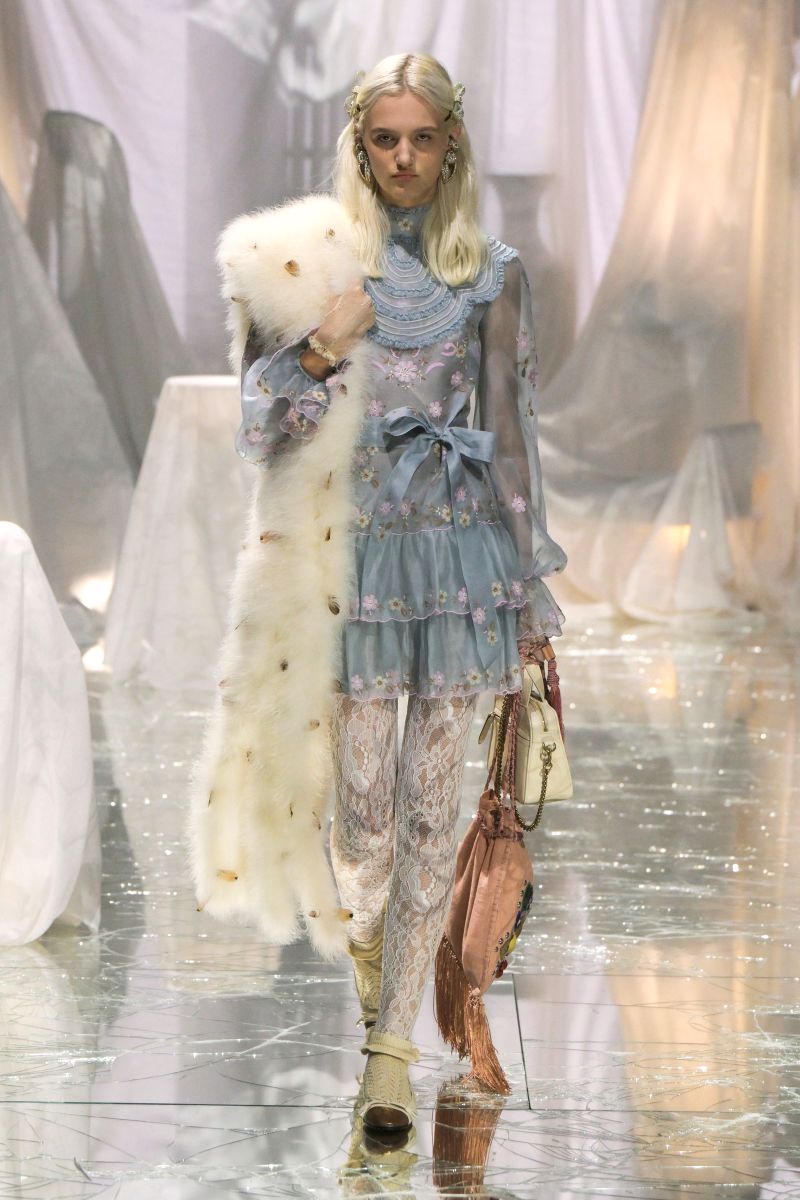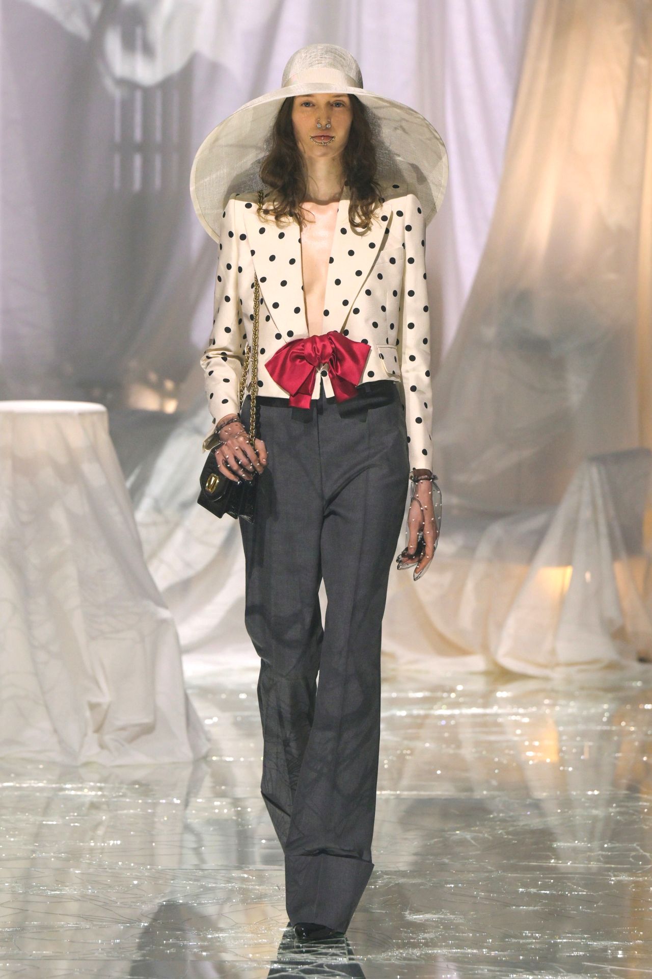 Alessandro Michele’s new era in Valentino has begun. His whole collection was imbued with the spirit of the 1960s and ’70s, with chiffon gowns adorned with intricate patterns of Swarovski crystals and floral-printed dresses paired with embellished waistcoats. Accessories, including wide-brimmed fedoras, chain-handle bags and diamond trimming, echoed the outfits.