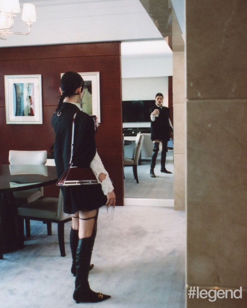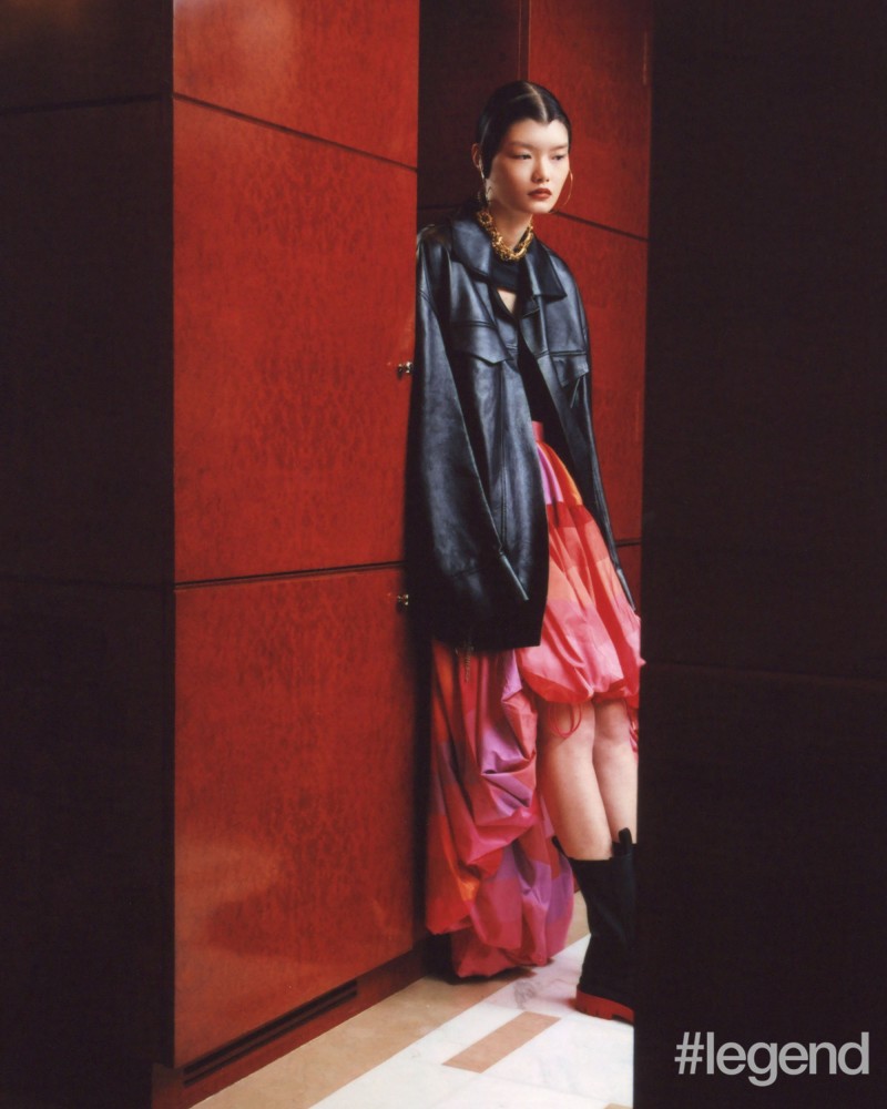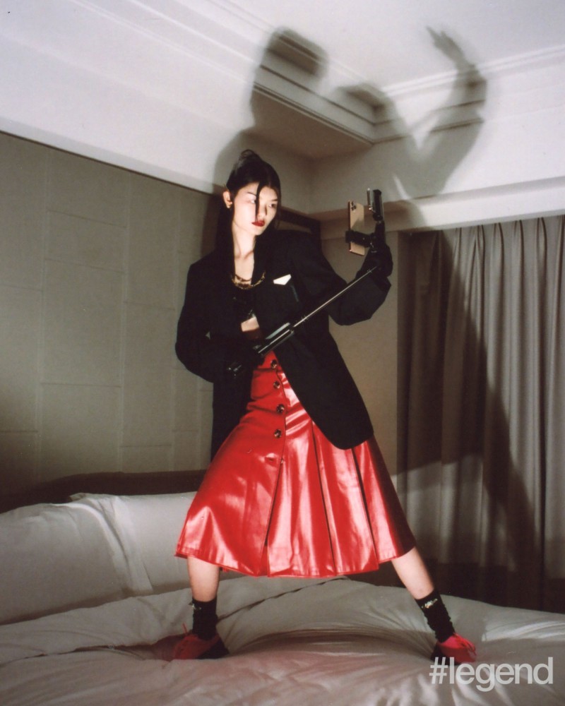 Model in Hyein Seo black blazer available from D-mop, 4 Moncler Simone Rocha black bra, A.W.A.K.E. Mode red leather skirt available from I.T, Simone Rocha black socks, Camper red and black sneakers, Ambush gold necklace and earrings and Gucci black gloves -