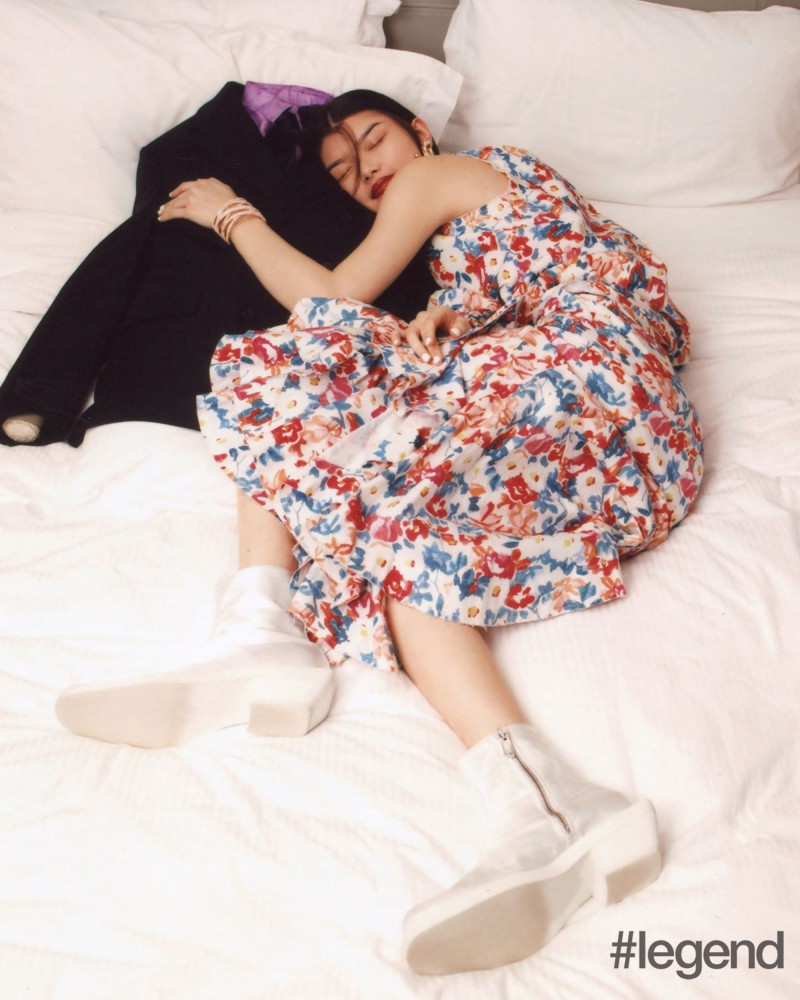 Model in JW Anderson floral top and matching skirt, MM6 white satin boots, Vann gold earring and Atelier Swarovski crystal cuff. On imaginary boyfriend Danilo Paura black blazer available from D-mop and Berluti purple shirt
