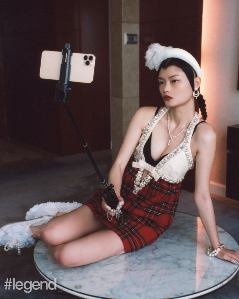 Model in Miu Miu tartan slip dress with pearl trim, MM6 Pearl bracelet white headband with flower, Simone Rocha white ruffle slippers and Atelier Swarovski crystal earrings and necklace -